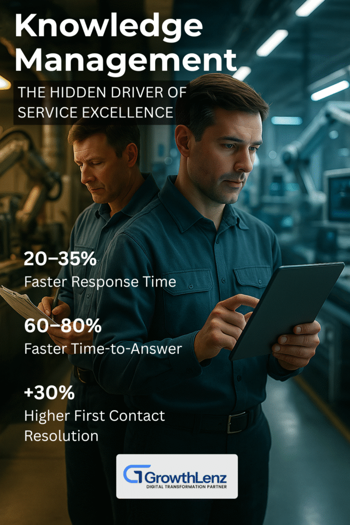 • Organizations that integrate AI-driven KM systems have seen 20–35% faster response times and 25% fewer repeat service calls.